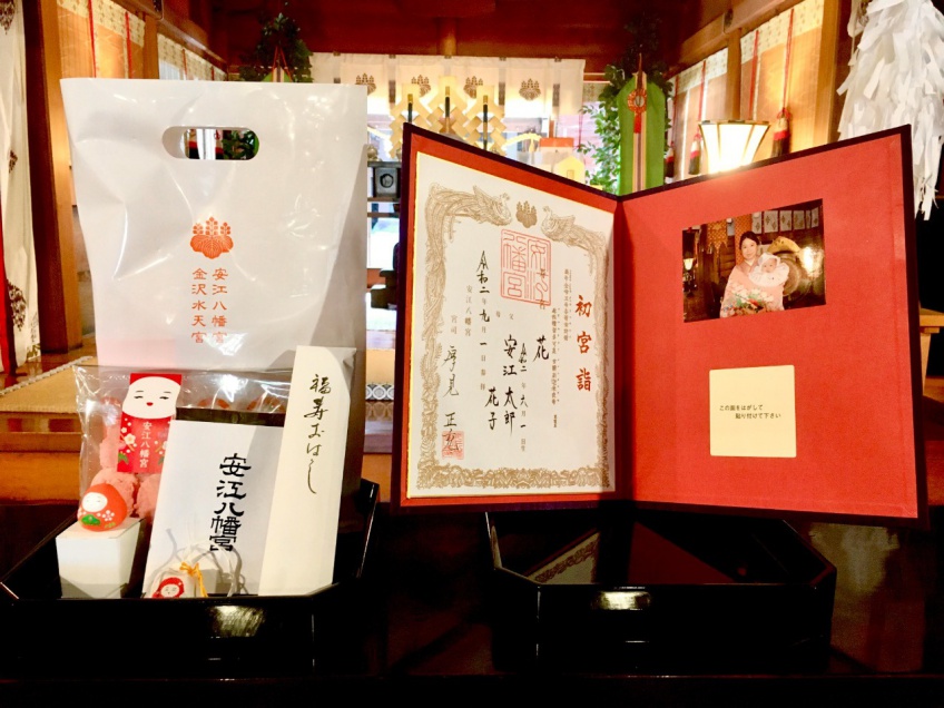 赤ちゃんは神さまの授かりものです。誕生して七日目の「お七夜」に名付けをし、わが家の神棚に命名書を貼り、まず神さまに奉告します。そして、 地方により差異はありますが、誕生後、男の子は三十日をすぎ、 女の子は三十一日をすぎ神さまにお参りするのが初宮参り(お宮参り)です。百日をすぎてお参りする方もいらっしゃいます。神さまのお力を受け、赤ちゃんの無事成長を祈願します。当社ではお参りされる際、お名前入りの写真つき記念誌を一組一組にお渡ししております。
